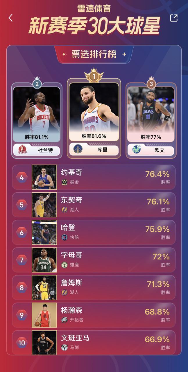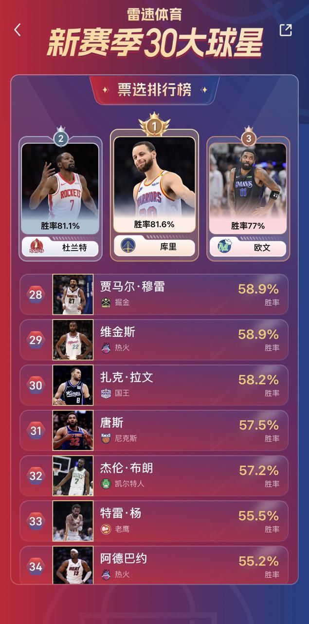 雷速NBA新赛季30大球星即时排名:库里反超KD升至第一