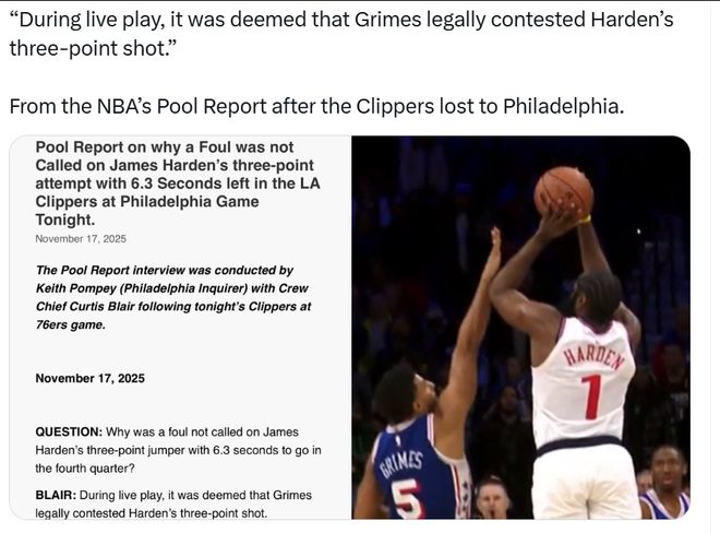 北京时间11月18日,在NBA常规赛中,洛杉矶快船以108-110不敌费城76人,在比赛最后时刻,哈登绝杀三分不中并示意被犯规,但裁判没有任何表示。赛后,本场比赛的主裁判布莱尔谈到了吹罚。